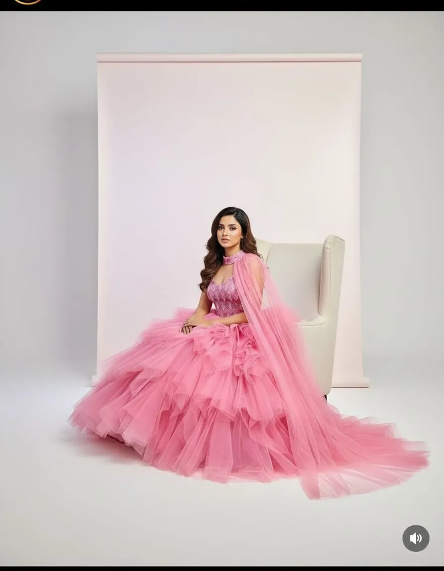The highlight of this design is the sheer net cape drape that adds a regal, contemporary touch—perfectly balancing romance and sophistication. With handcrafted floral ruffle detailing at the waist and a voluminous skirt finish, this ensemble is ideal for women who want a statement look that feels light, graceful, and luxurious.