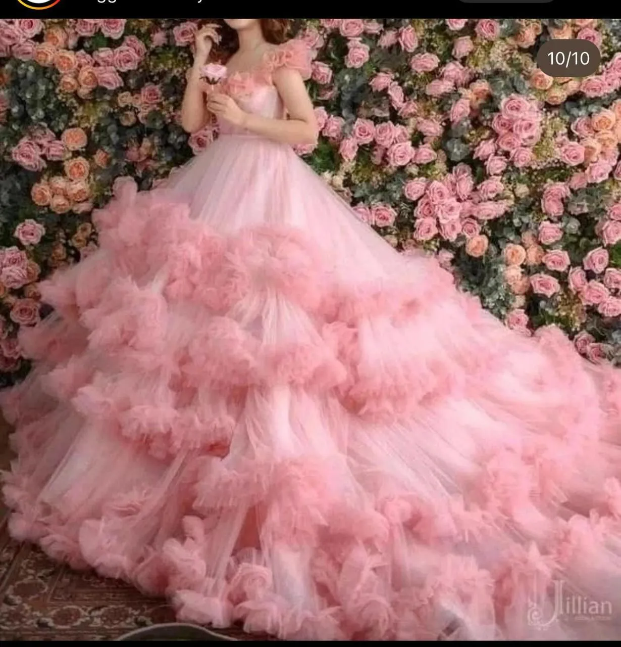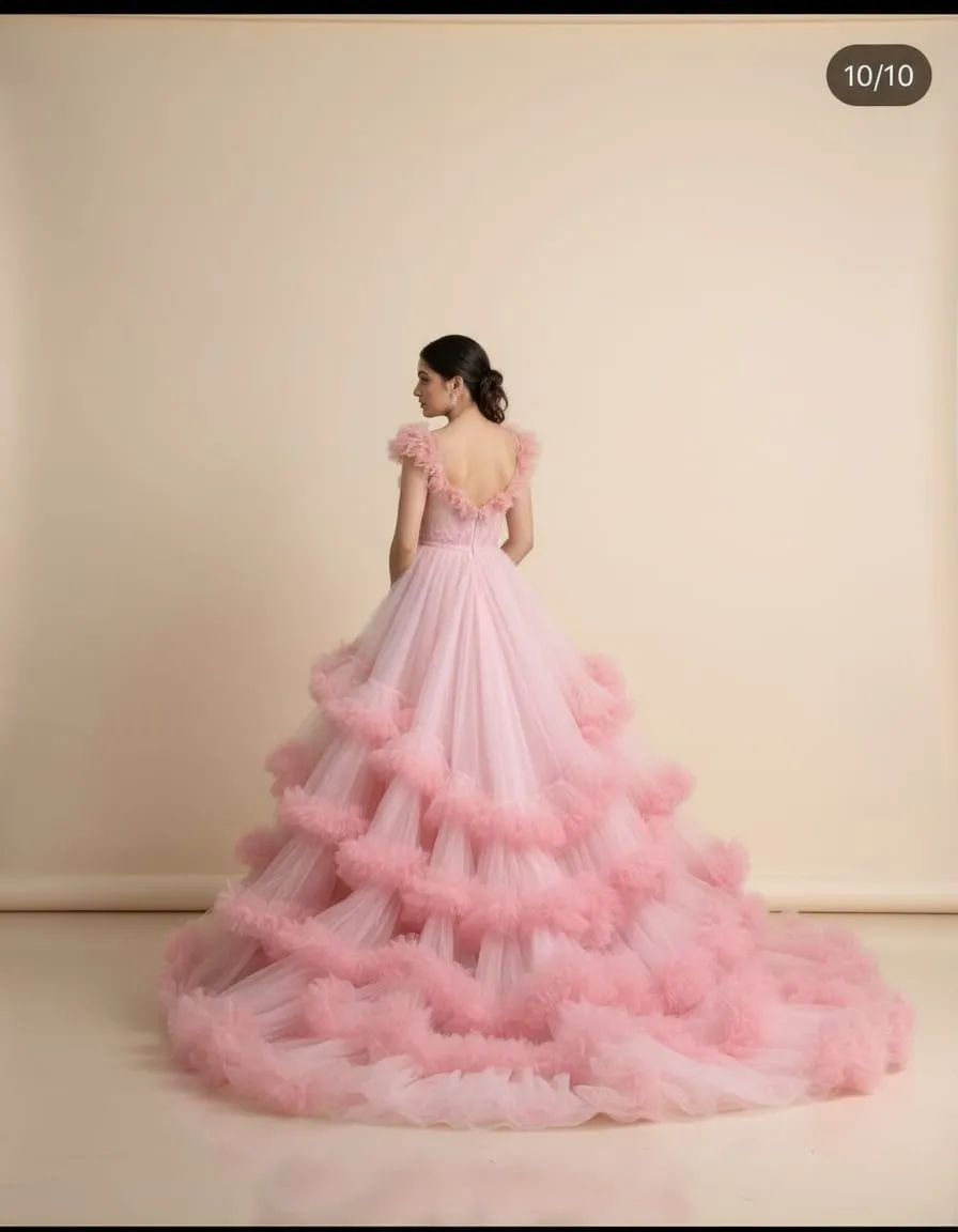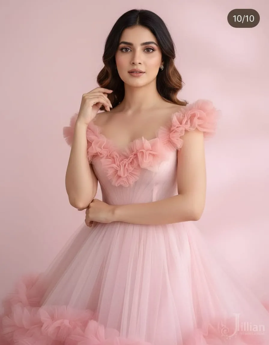 Soft, romantic, and irresistibly elegant, this Blush Pink Floral Ruffle Couture Ball Gown is crafted for women who love fairytale drama with a refined finish. Designed with a delicate floral-inspired bodice and subtle ruffle detailing at the shoulders, this gown flows into an ultra-voluminous multi-layered tulle skirt adorned with cloud-like ruffles for maximum couture impact.