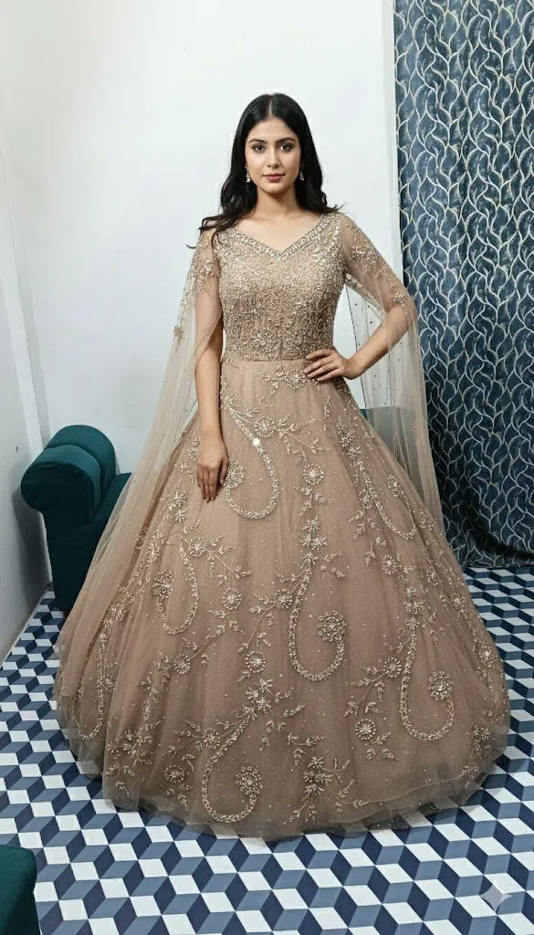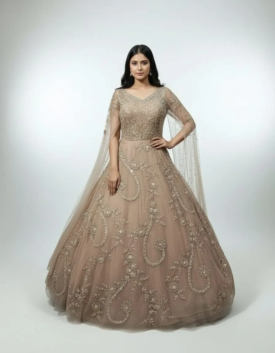 The soft sheer cape sleeves add a royal and graceful aura, making every step feel like a fairytale moment. Crafted in rich premium net with satin lining, it offers both luxury and comfort for long hours of celebration.