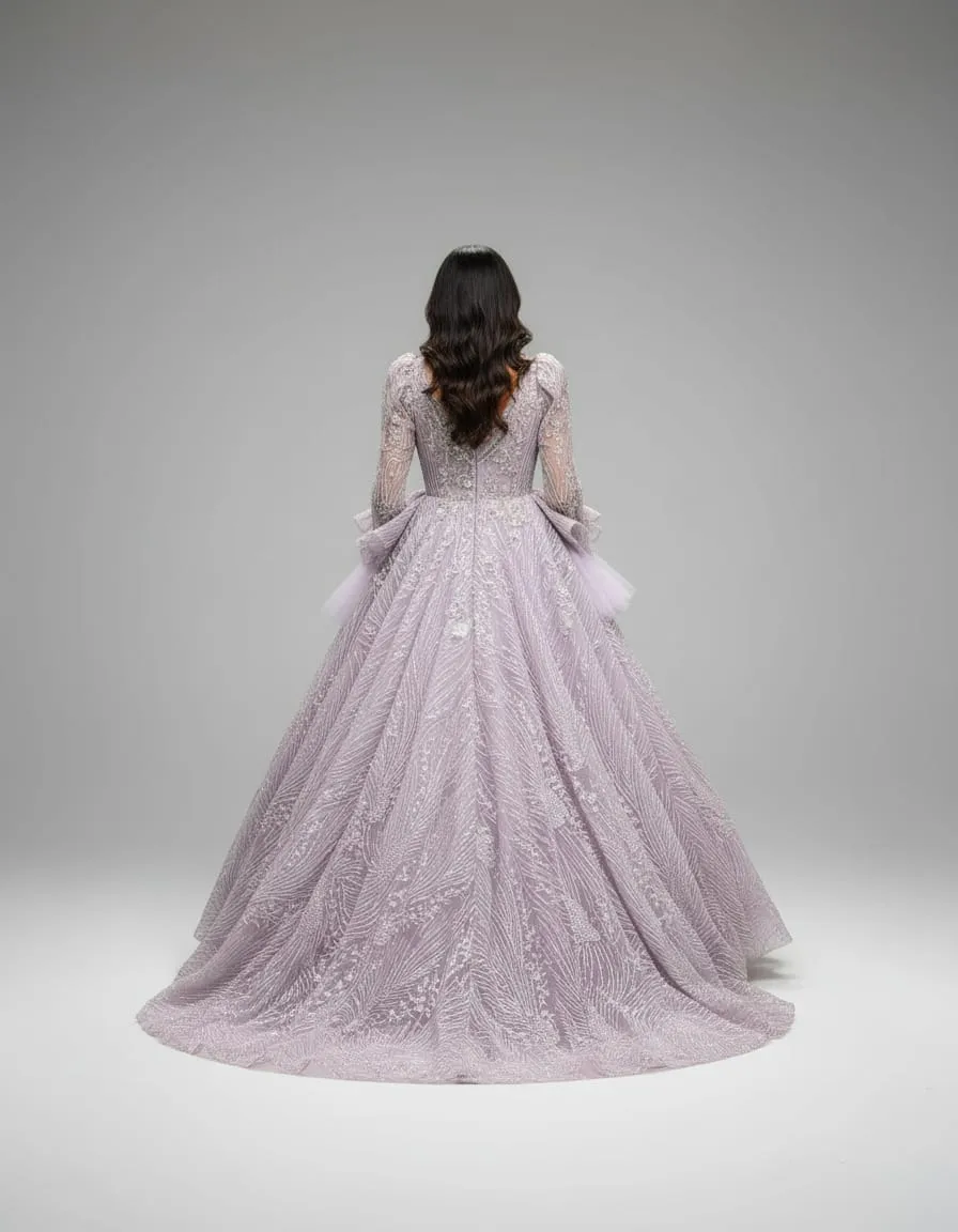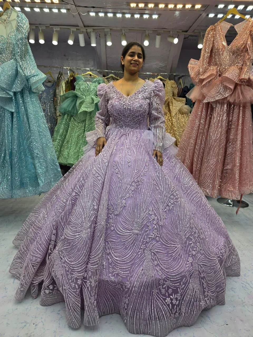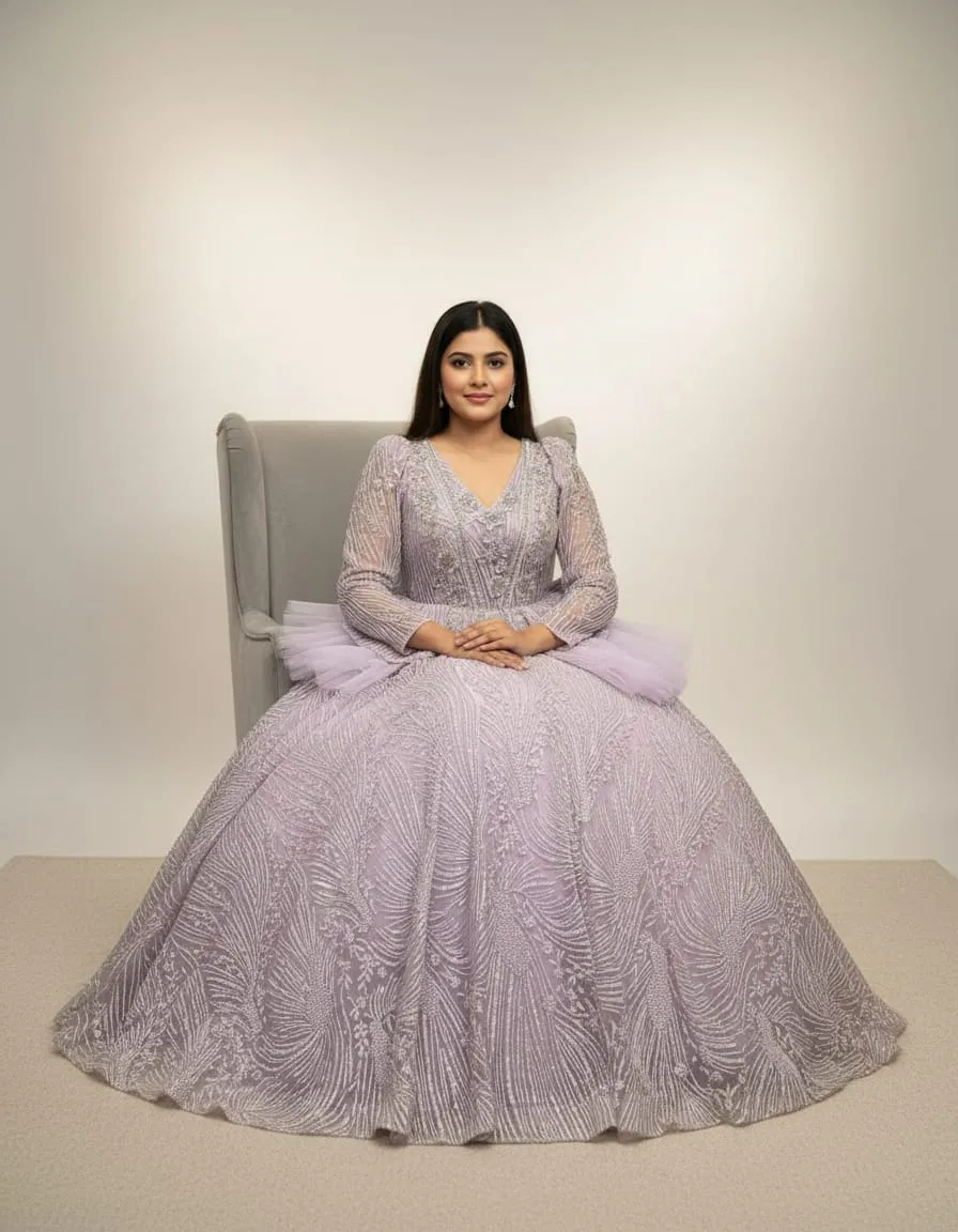 Turn every head the moment you walk in! This Lavender Luxe Gown is an art piece crafted with intricate glitter embroidery in a flowing botanical pattern. The rich lavender shade gives a dreamy, royal vibe — ideal for brides-to-be and fashion-forward divas.