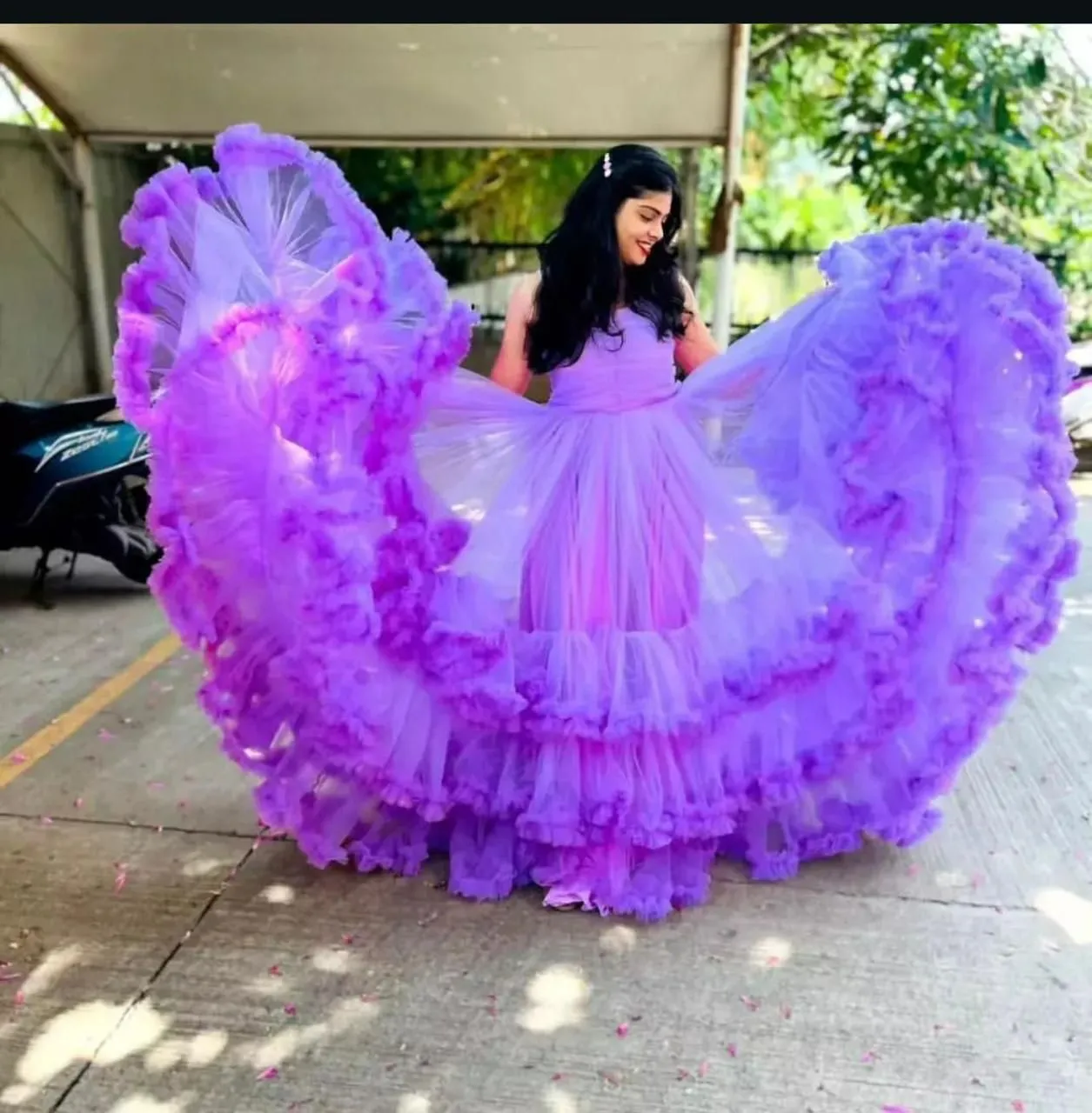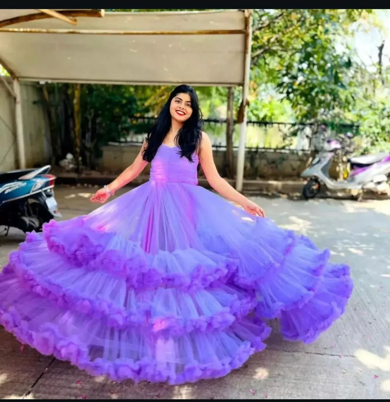 Step into a fairytale moment with this Lilac Dream Layered Tulle Gown, designed for women who love soft colours with dramatic volume. Featuring a sleek sleeveless bodice with a flattering square neckline, this gown flows into a breathtaking high-volume skirt crafted with multiple tiers of soft ruffled tulle.