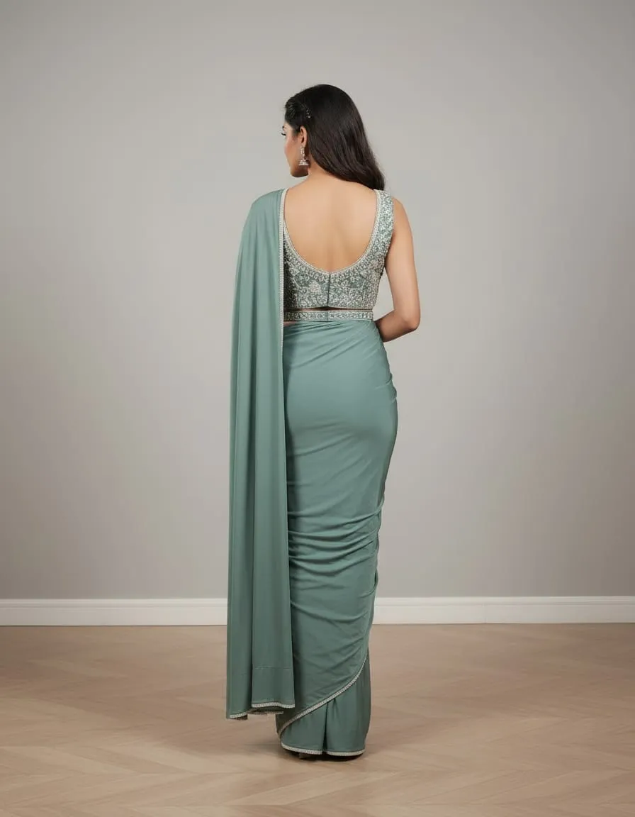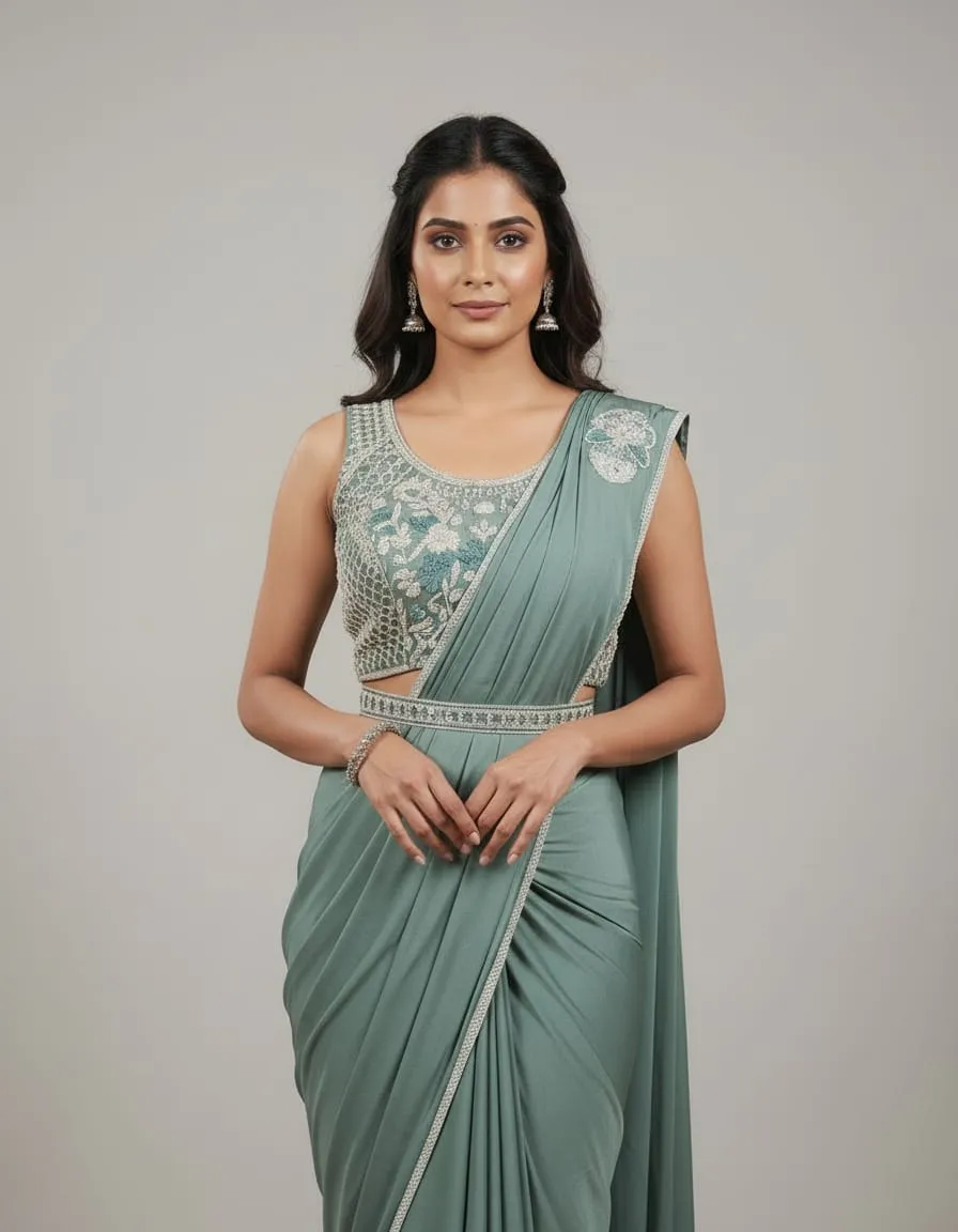 This pre-stitched saree is crafted in a soothing sage green flowy fabric that drapes beautifully, creating a flattering silhouette. The intricately embroidered blouse adds a regal touch with fine zari and thread detailing, while the sleek belt-style waist accent gives a contemporary finish.