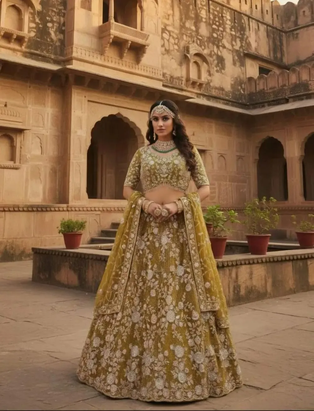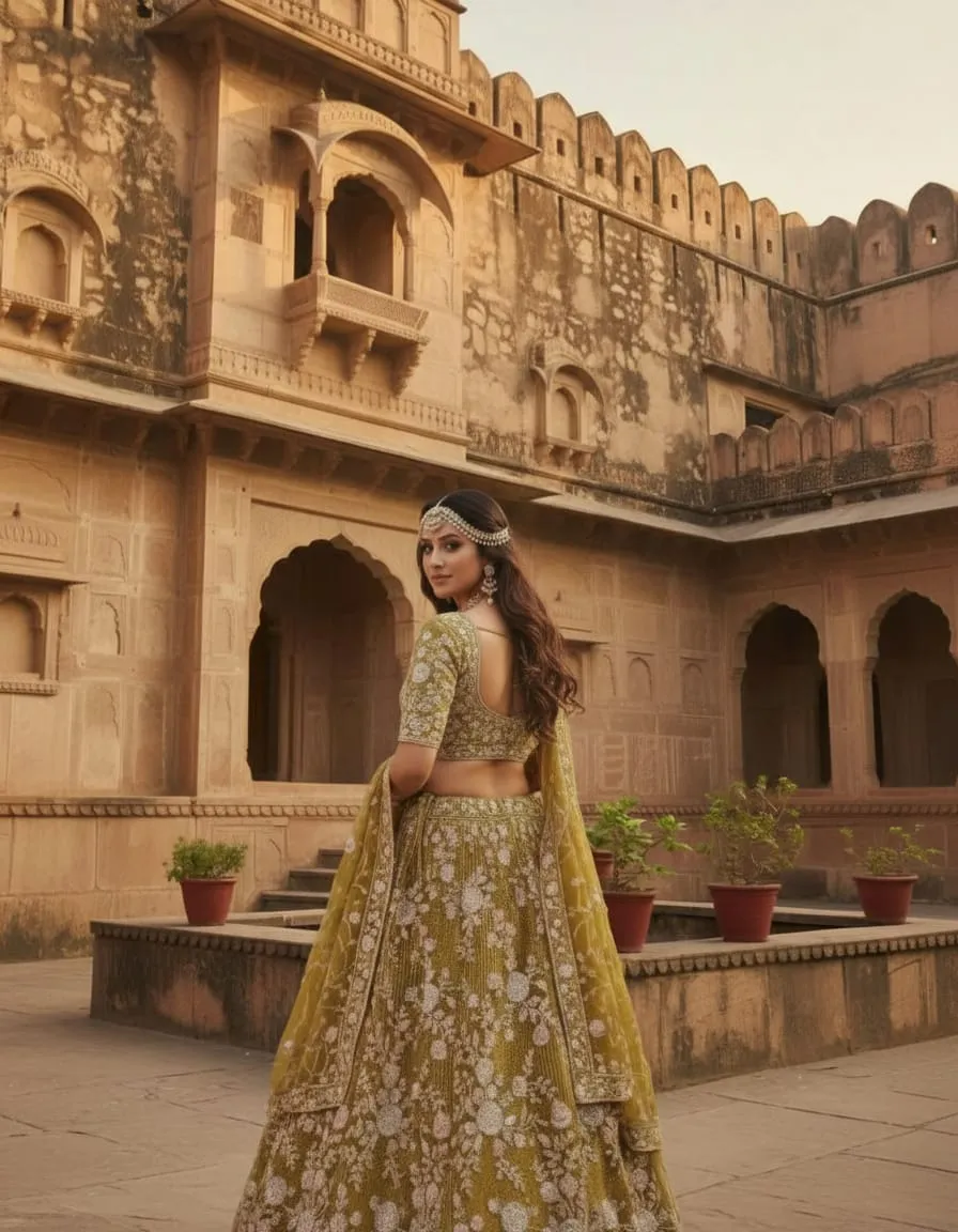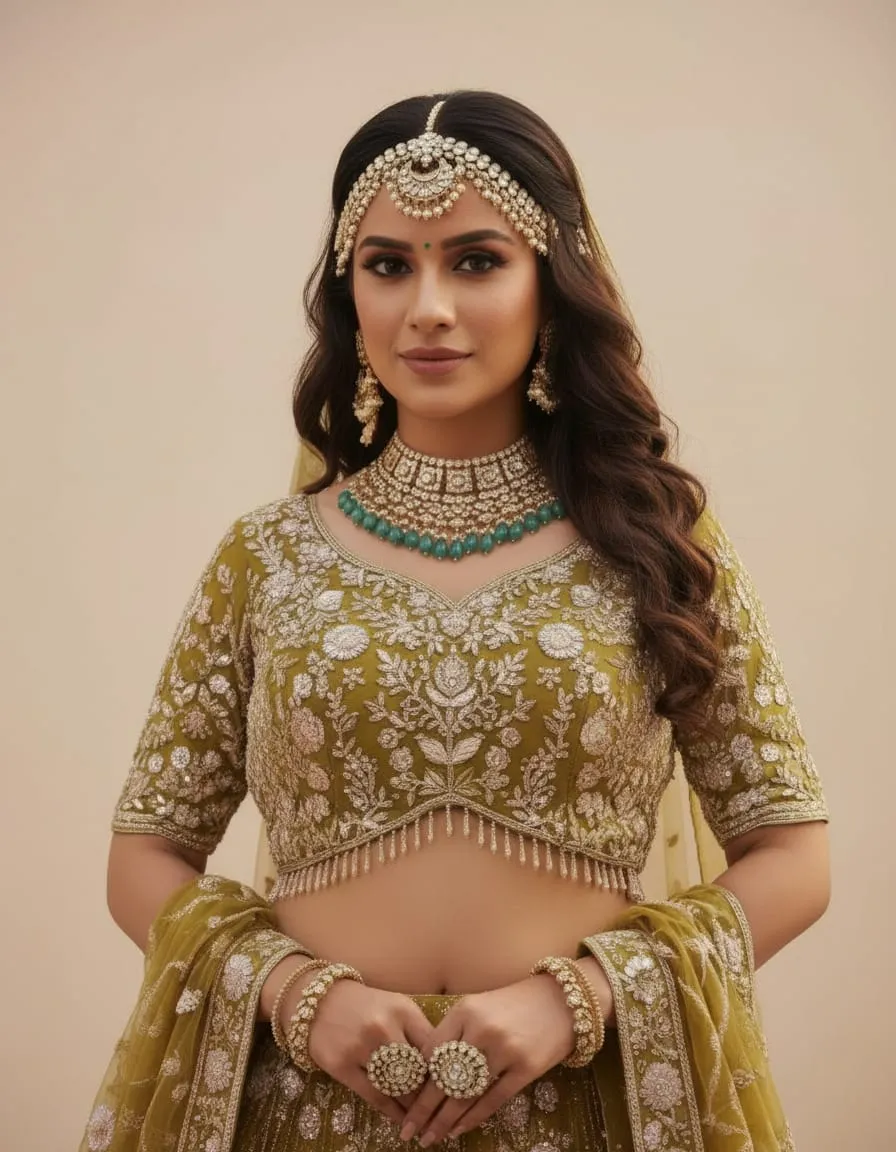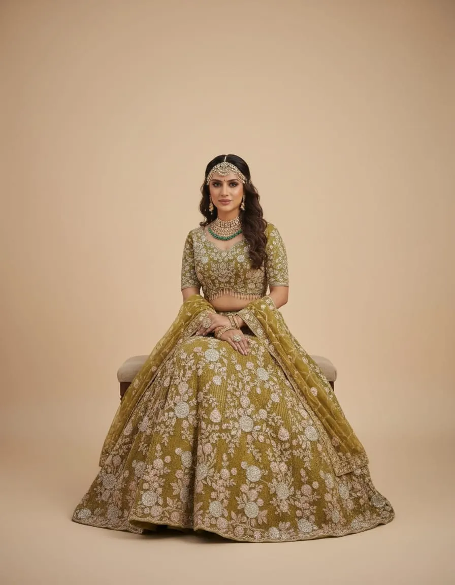 Radiate elegance and tradition with this luxurious mustard yellow lehenga — a perfect balance of royal heritage and modern fashion. The intricate white floral embroidery paired with shimmering sequin highlights creates a breathtaking effect that photographs beautifully in all lighting.