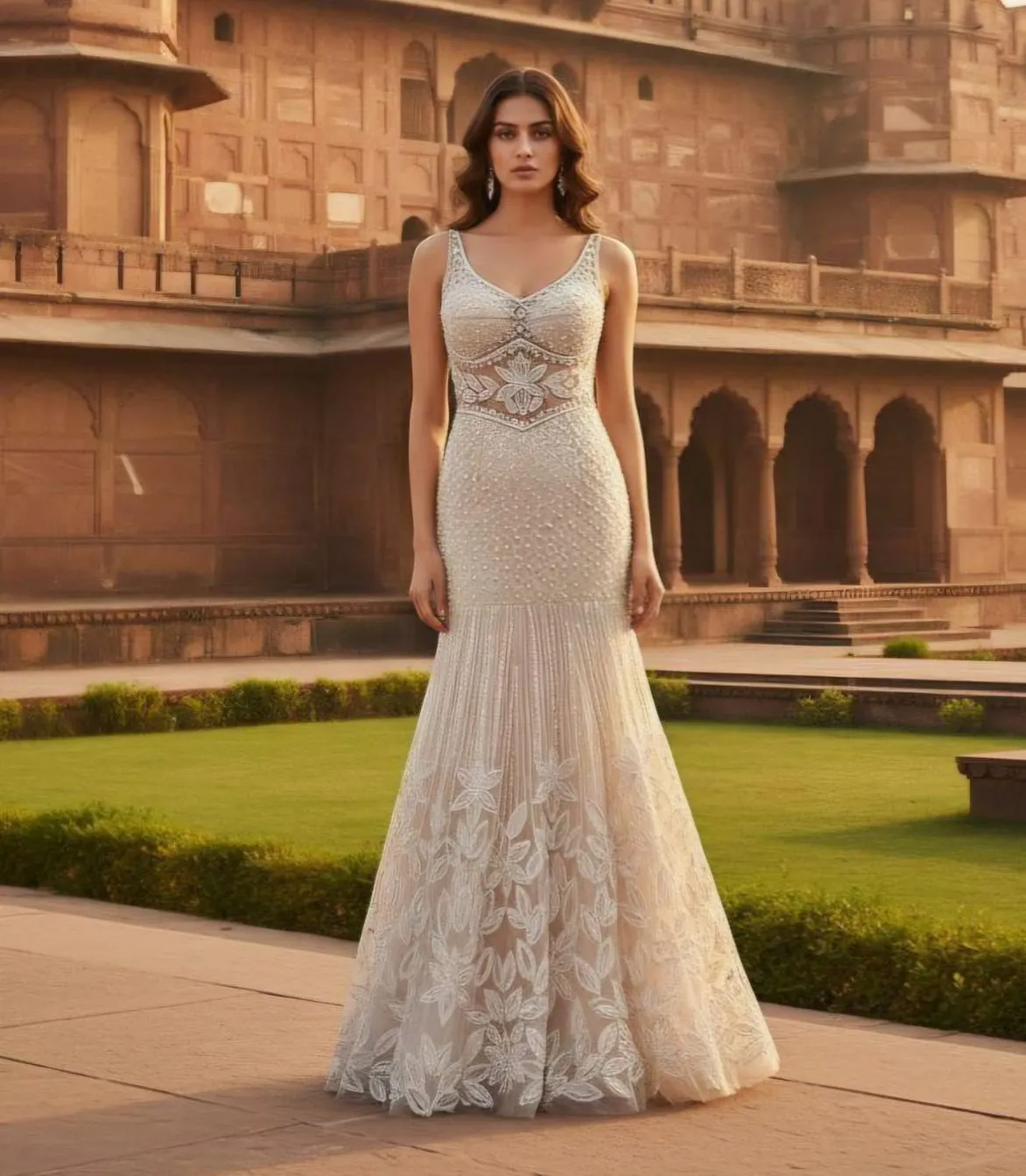 Off-White Pearl Embellished Mermaid Gown – Luxury Reception & Cocktail Wear