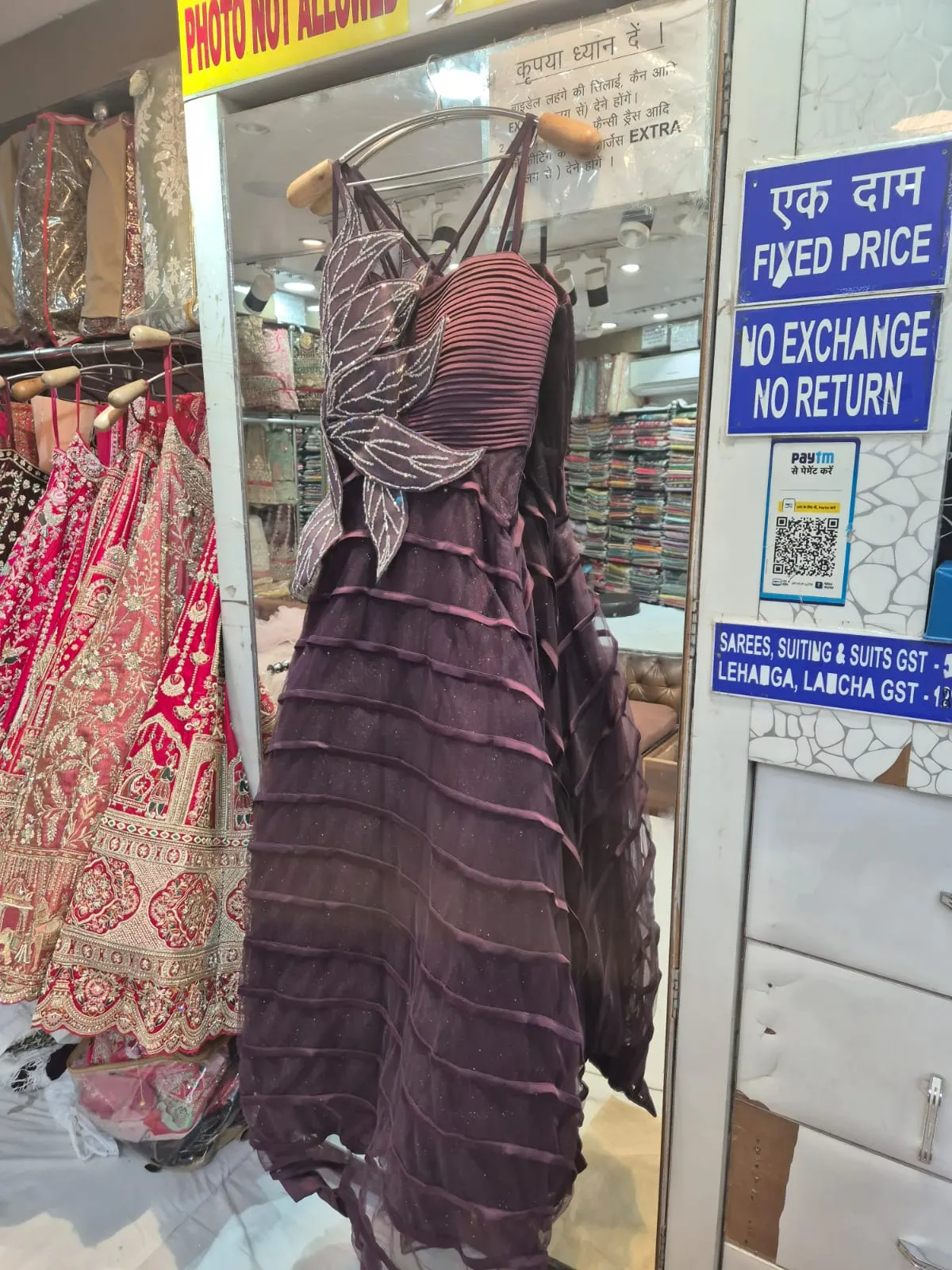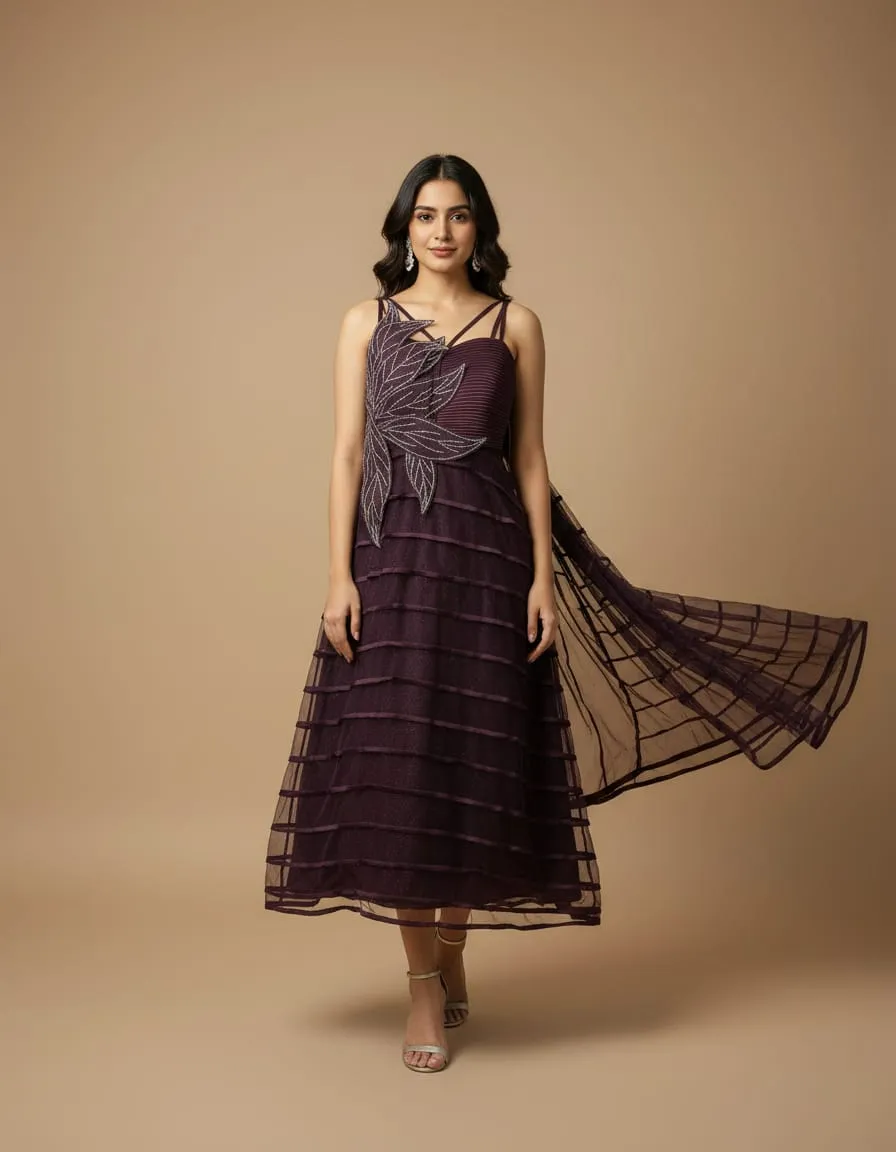 The Plum Noir Cocktail Gown features dramatic leaf-inspired embroidery on the bodice with shimmering beadwork, paired with a pleated structured bust and luxurious layered shimmer net fall.