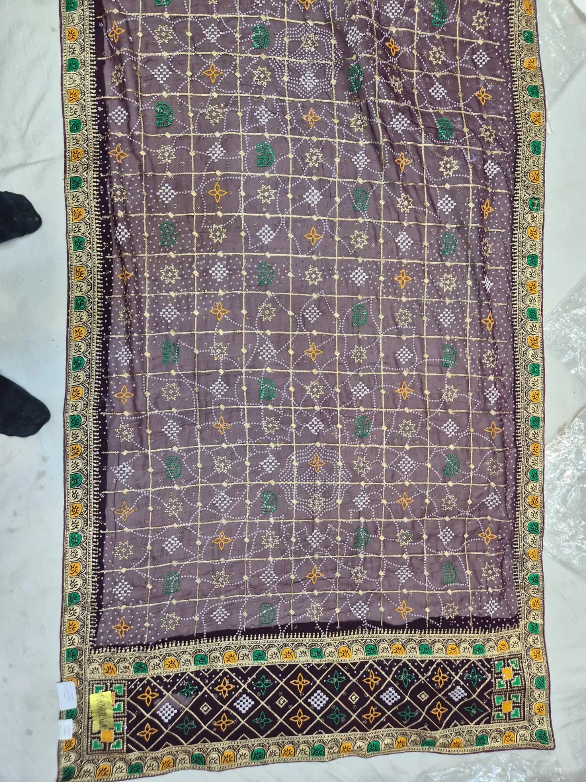 Celebrate timeless Indian artistry with this regal Plum Purple Silk Saree, beautifully crafted in a classic bandhani-inspired grid pattern. The body features delicate diamond checks highlighted with traditional dotted motifs and multicolor woven paisleys in green, mustard and ivory — giving it a royal Rajasthani and Gujarati heritage feel.