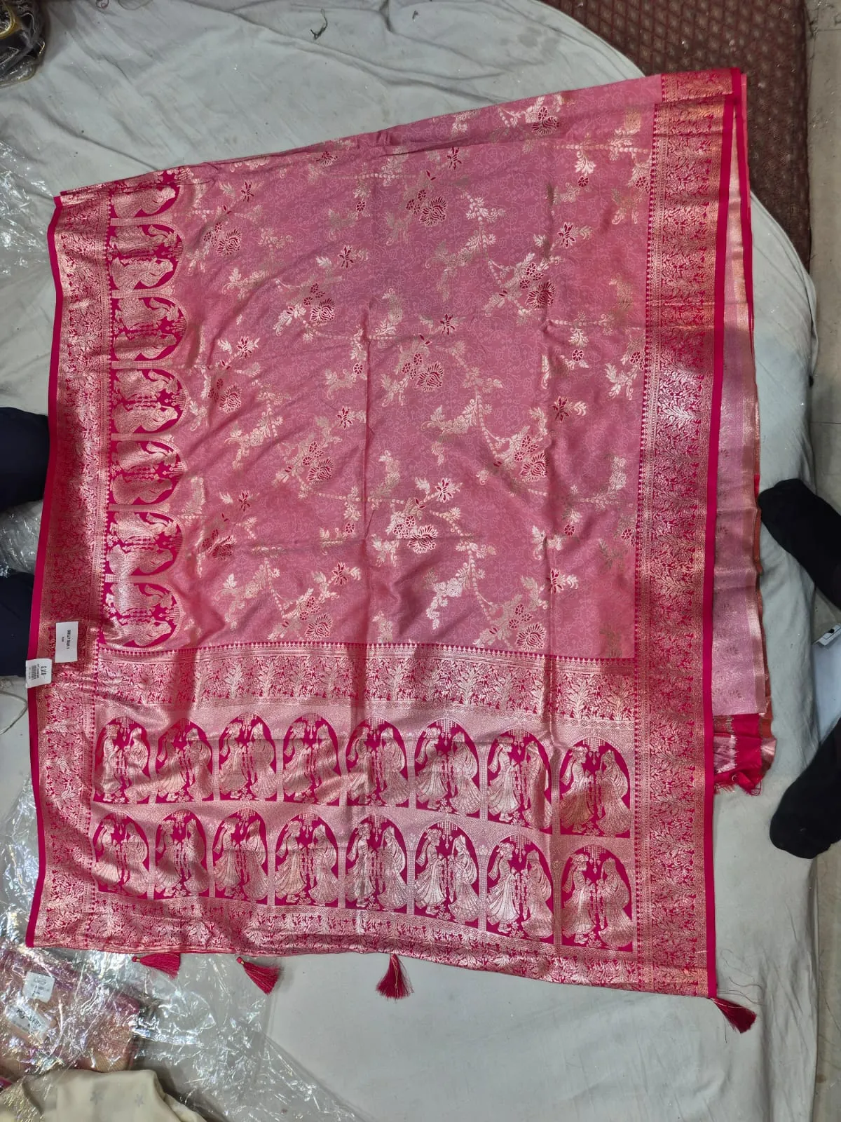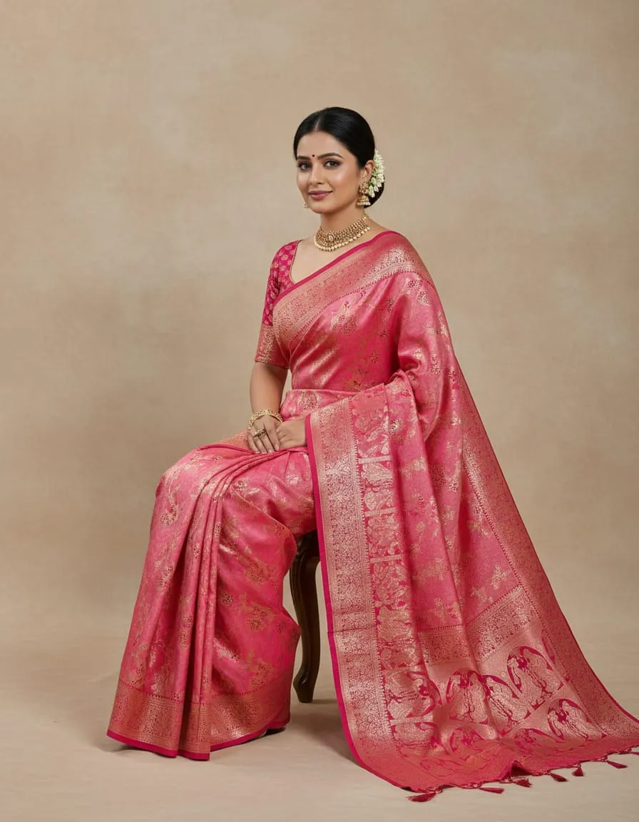 The Rajkumari Rani Banarasi Silk Unstitched Blouse Fabric is a celebration of traditional Banarasi artistry. Woven in a rich rose-pink silk base, this fabric features delicate all-over floral butis highlighted with shimmering zari work.