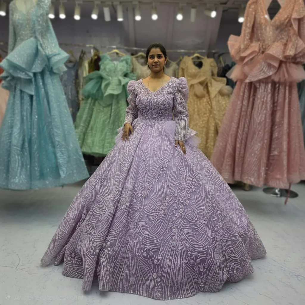 Make a grand entrance in this luxurious lavender ball gown, a masterpiece designed for women who adore a royal, glamorous look. Crafted with a 3D embroidered pattern, this gown shines from every angle with its intricately beaded embellishments and architectural flare.
