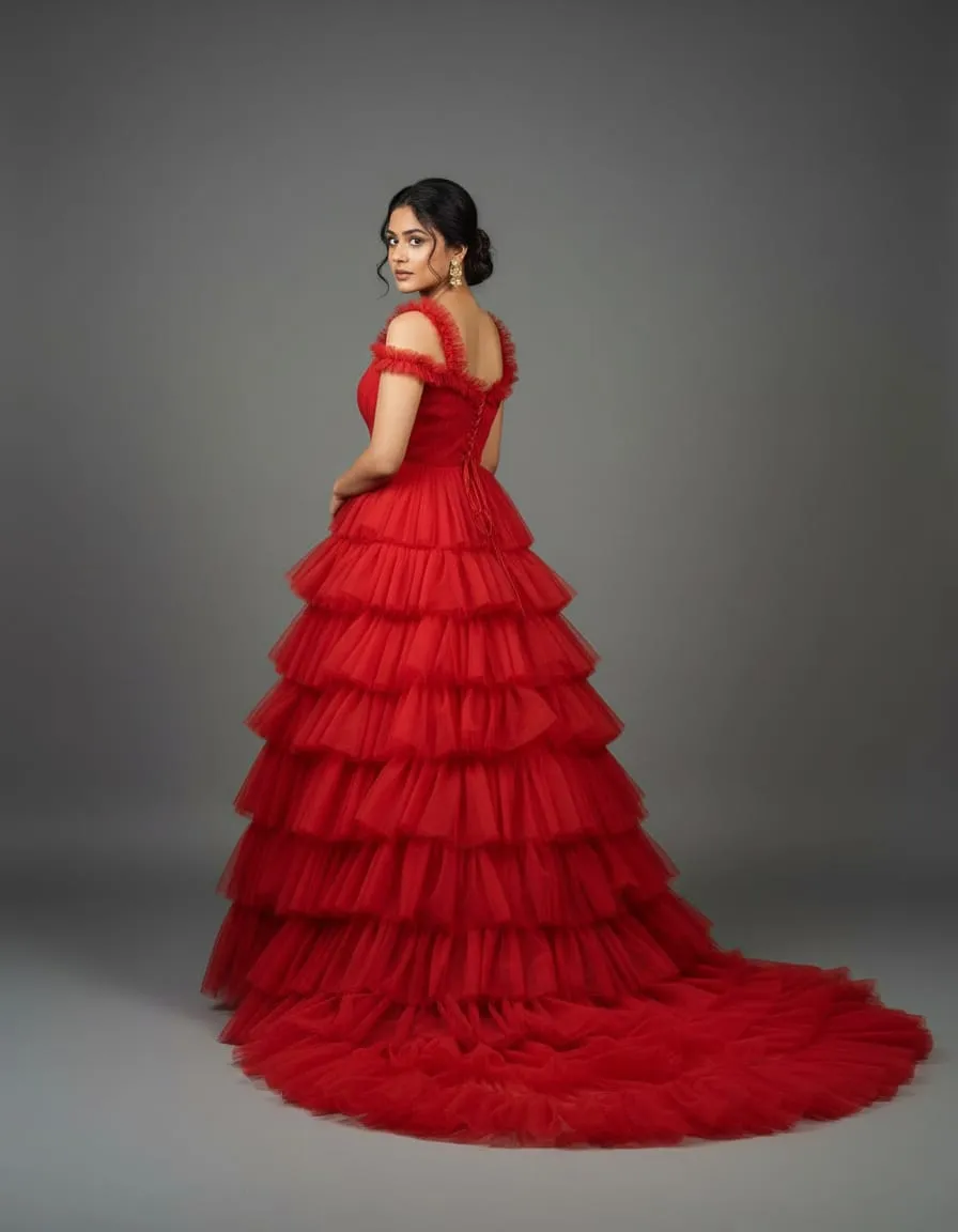 Make an unforgettable entrance with this Royal Scarlet Train Gown — designed for queens who love the spotlight. Featuring dramatic multi-layered ruffles from waist to hem and an ultra-long trail, this masterpiece promises a stunning, flowy silhouette in every step and every frame.