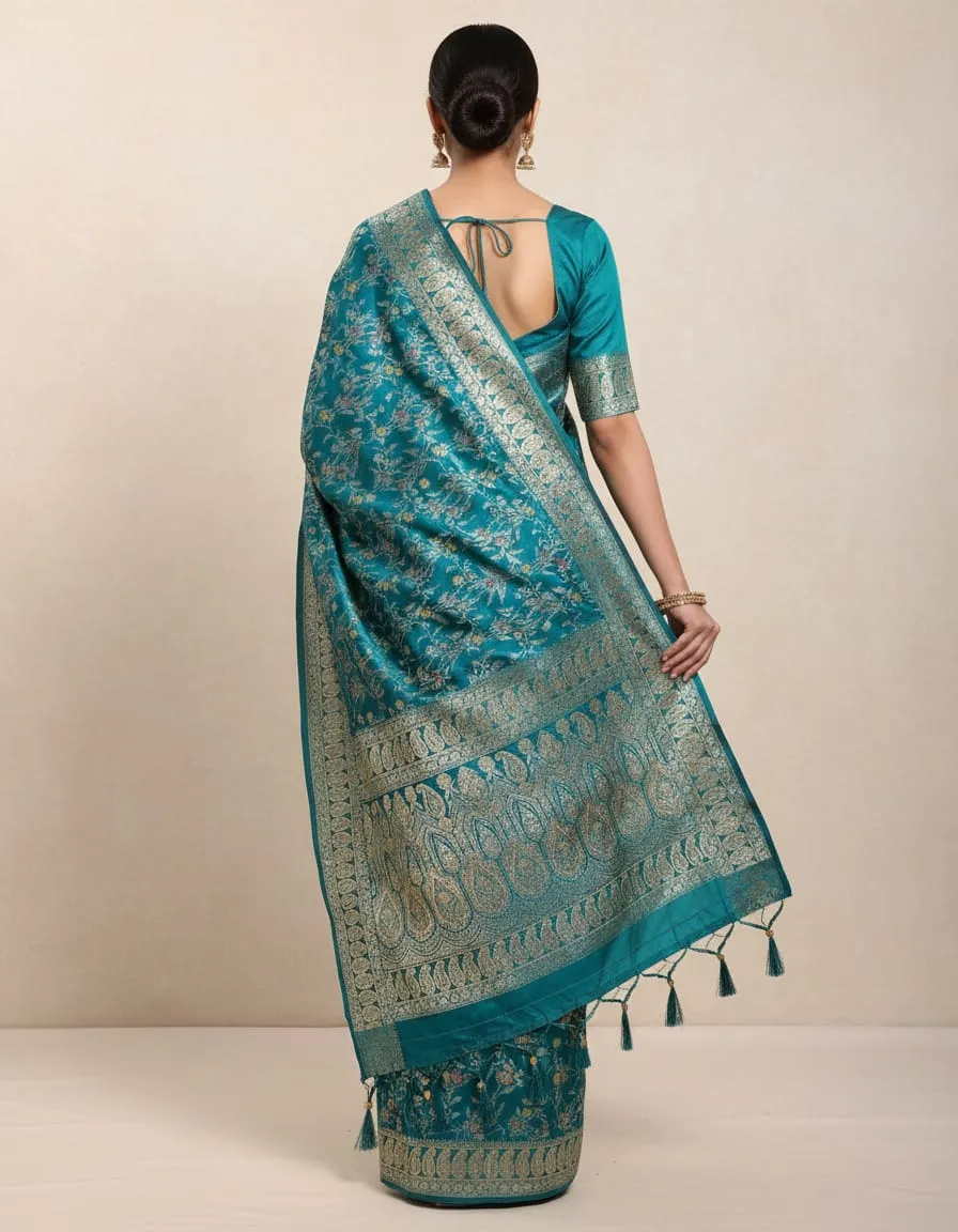 The saree features a luxurious teal blue base decorated with delicate multicolor floral jaal weaving across the body, giving it a fresh and festive glow. The grand pallav is highlighted with intricate antique gold zari paisley and arch motifs, beautifully finished with a heavily woven heritage border. Tassel detailing on the pallav edges adds a statement royal finish.